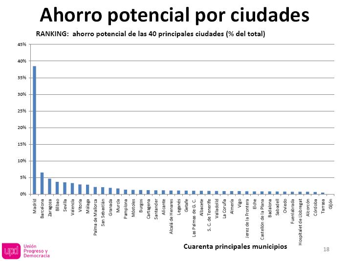 El estudio analiza los datos del año 2009, el último que ofrece estadísticas completas para analizar la eficiencia o, lo que es lo mismo, la relación entre los recursos que gasta la administración local para su propio funcionamiento en contraposición a los recursos que gestiona. Los autores analizan el gasto de los capítulos I (personal) y II (corriente) de los presupuestos de los 40 principales municipios en términos per cápita y en relación a las tres mejores ciudades, es decir, las más eficientes, inspirándose siempre en el Criterio de Maastricht de la Unión Europea Monetaria. Los autores concluyen que los españoles nos podríamos ahorrar cada año, y sin menoscabar el servicio prestado a los ciudadanos, la nada desdeñable cantidad de 6.211 millones de euros; es decir, aproximadamente el 0,6% del PIB nacional.