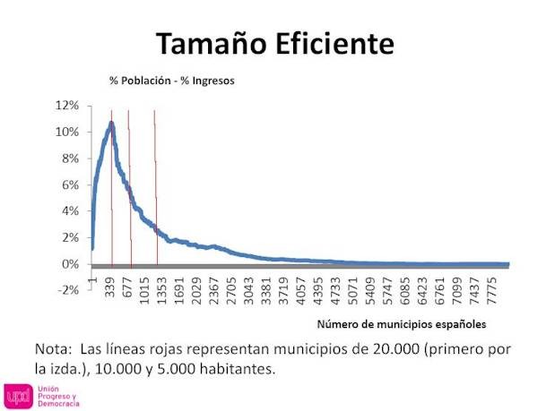 Los gráficos en los estudios económicos son reveladores, porque resumen con precisión las conclusiones de multitud de datos. Tal es el caso presente. Por un lado se ha medido el porcentaje de la población total de los municipios y, por otro lado, se ha contrapuesto el correspondiente del gasto municipal para la suma de municipios ordenados desde el mayor (Madrid) al más pequeño. La principal conclusión que se desprende de este gráfico es que la escala más eficiente en España es la de municipios con 20.000 habitantes, donde los mismos ingresos pueden brindar servicios a un mayor número de residentes. A partir de ese tamaño municipal, cuesta progresivamente más dar los servicios mínimos a la población. En ciudades con más de 20.000 habitantes existen economías de escala, con contadas excepciones, aunque no son tan eficientes como los municipios de 20.000 debido a problemas de gestión y de congestión. En municipios con menos de 20.000 habitantes, las economías de escala desaparecen rápidamente, lo que lleva a los autores del informe a presentar una simulación del ahorro potencial que resultaría de concentrar los municipios en agrupaciones de 20.000 habitantes: 16.142 millones de euros al año.
