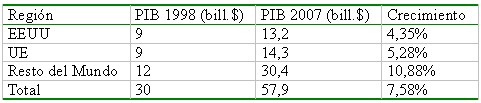 En cuanto a participación, si en 1998 el Resto del Mundo era el 40% del PIB Mundial, en 2007 es el 60%. En otras palabras, el PIB del Resto del Mundo crece bastante más deprisa que el de EEUU o la zona euro. Casi el doble de rápido. Pero lo que debemos señalar es que el valor del PIB de EEUU y la UE en 1998 y 2007 y su evolución son muy parecidos. ¡Hay que darse prisa, el resto corre mucho!.