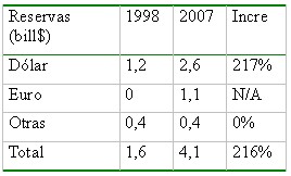 El Euro, que era inexistente en 1998, acaparó 1,1 billones de dólares en Reservas en 2007. Con el proceso de creación del Banco Central Europeo (BCE) se han obtenido importantes beneficios de escala, en particular, en lo que afecta a las Reservas medidas de Metálico, Oro y SDR (Derechos Especiales de Giro) para los países que conforman el Euro.