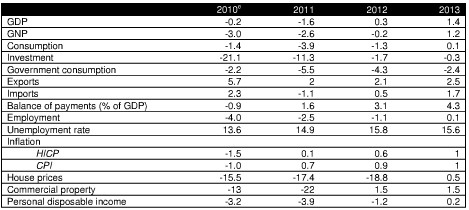 Para estimar esas necesidades de capital, el banco central contempla diversos escenarios. En el peor de los casos, el precio medio de la vivienda volvería a bajar hasta un 55% en 2011 respecto a sus valores máximos (época de la burbuja) y hasta casi un 60% en 2012. Prevé además una caída del PIB del 1,6% este año y un aumento del 0,3% el próximo.