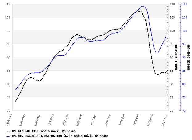 La recuperación que apuntaba en el primer semestre de 2010 ha abortado y tan solo dos sectores se hallan en positivo. El primero de ellos es el turismo, del que hablaremos próximamente, y el segundo es la industria, cuyo indicador más fiable, que es el IPI (índice de producción industrial), creció débilmente (+0,4%) en el último trimestre de 2010 y empezó con algo más de fuerza 2011 (+3,8% en enero).