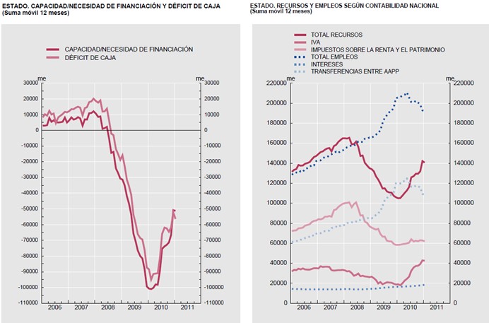 De este modo, el gasto público aumentó un 15,7% si compramos los PGE de 2007 y 2010, mientras que los ingresos cayeron un -12,3%. La evolución de estos saldos se observa a la perfección en los siguientes gráficos, que reflejan el deterioro de las cuentas del Estado (sin incluir CCA y Ayuntamientos):