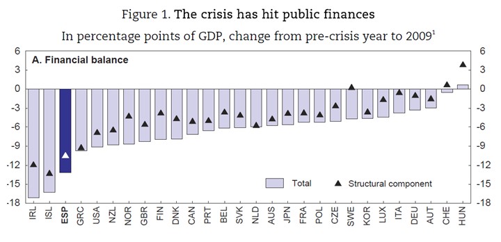 Y es que, España ha sufrido el mayor deterioro fiscal de los países desarrollados (OCDE) durante este período. Tras el estallido de la crisis financiera internacional a mediados de 2007 y su posterior materialización en lo que se ha venido a denominar la Gran Recesión, los países más desarrollados del planeta, agrupados en torno al G-20, pusieron en marcha amplios y extensos planes de estímulo fiscal con el ilusorio fin de impulsar la ansiada recuperación.