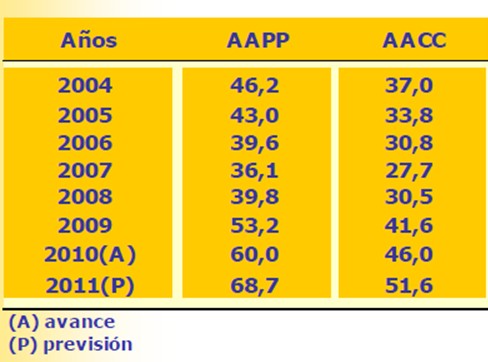 Gastos (interanual): aumento del 8,8% en 2008; 7,4% en 2009; y caída del 1% interanual en 2010.