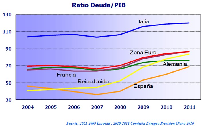 Una cantidad que, sumada a las previsiones de deuda pública que maneja el propio Gobierno, alcanzará el 70% del PIB en 2011. Es decir, cuando Zapatero abandone el poder habrá duplicando la deuda pública existente, hasta el punto de alcanzar el endeudamiento público de Alemania: del 36% del PIB en 2007 al 70% en 2011.