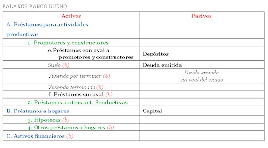 El balance inicial, en el que se confunden activos buenos y malos, es segregado en dos balances (banco bueno y malo) claramente diferenciados para eliminar incertidumbre al inversor. De este modo, la idea inicial del banco malo consistiría, probablemente, en crear un holding, cuyo activo estaría formado por los activos malos y las acciones del banco bueno, mientras que en los pasivos se encontraría la deuda correspondiente y el capital.