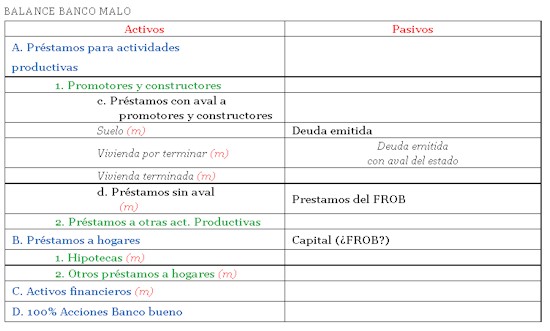 "En este caso nos imaginamos que el papel de capital lo realizará el FROB, aunque en puridad es deuda (¡y al 7.5%!). El resto de los pasivos serán probablemente deudas garantizadas por el Estado", indican ambos. Y es que, los acreedores tienen derecho a vetar las escisiones-segregaciones, "y no es de imaginar que ningún acreedor privado esté muy dispuesto a aceptar la pérdida" que conlleva quedarse en el banco malo. De este modo, las dos entidades quedarían dividas y diferenciadas. "El banco bueno queda limpio de activos tóxicos".