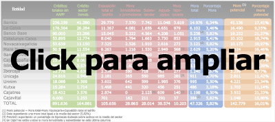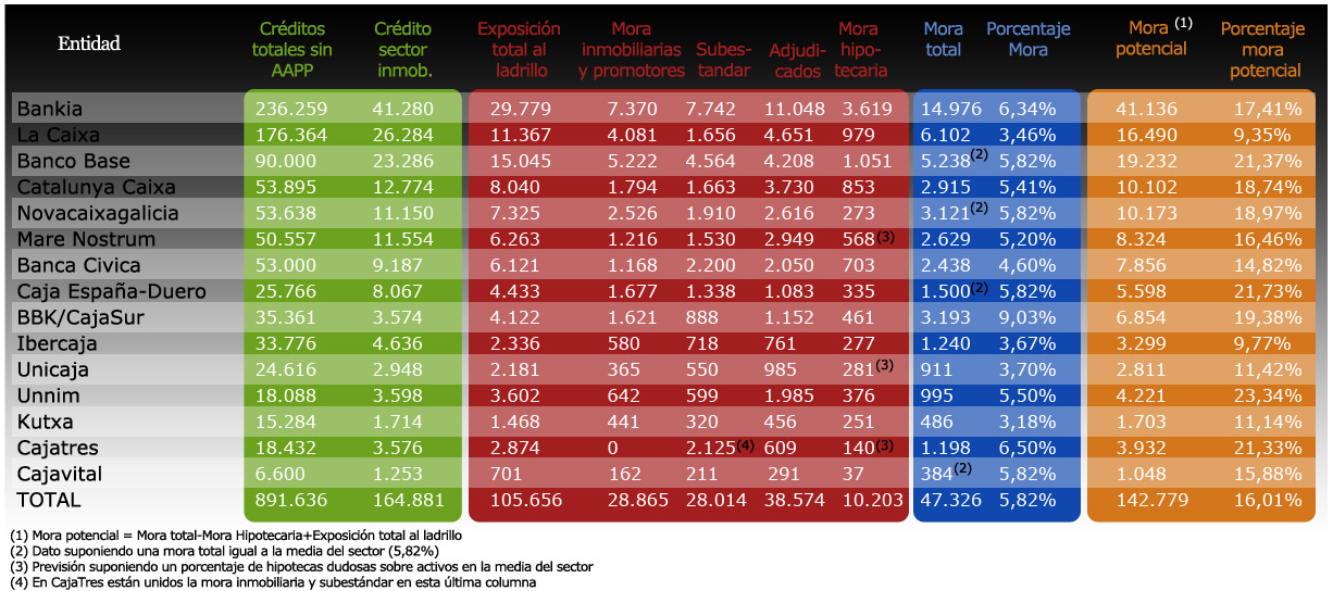 Por último, cabe determinar el volumen de activos tóxicos. En el caso de Bankia, añaden, el banco malo tendrá 53.000 millones de euros en activos, unos 41.000 millones de activos problemáticos (mora potencial en la tabla) más los 12.000 millones de acciones del banco bueno. "Y el 10% que debe ser el capital de una entidad así, no cotizada en bolsa es aproximadamente lo mismo que el préstamo del FROB (4.465 millones)" a Bankia, indican los economista.
