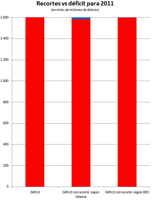 Sobre un déficit de 1,6 billones de dólares, el recorte anunciado por Obama sólo representaría una reducción del 2,38% del déficit para el ejercicio corriente (hasta el 30 de septiembre). Sin embargo, según la estimación de la CBO, estas medidas, en realidad, sólo reducirán el déficit en un 0,02% este año.