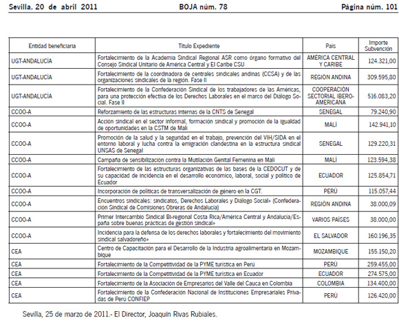 En el caso andaluz, UGT Andalucía recibe dinero para ayudar al fortalecimiento de la Academia Sindical Regional ASR como órgano formativo del Consejo Sindical Unitario de América Central y El Caribe CS; para el fortalecimiento de la coordinadora de centrales sindicales andinas (CCSA) y de las organizaciones sindicales de la región y para el fortalecimiento de la Confederación Sindical de los trabajadores de las Américas, para una protección efectiva de los Derechos Laborales en el marco del Diálogo Social. En total,930.000 euros.