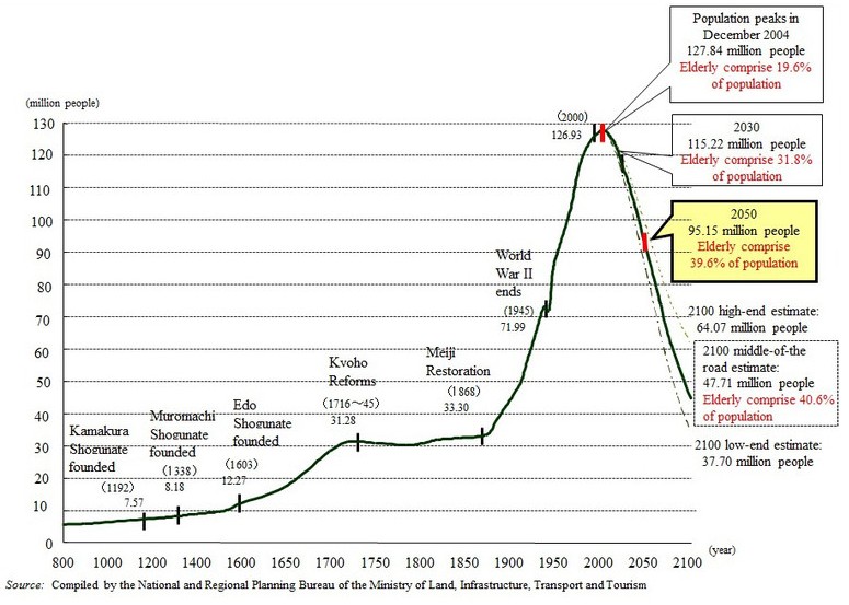 Si proyectamos esta población tres generaciones en el futuro (suponiendo invariantes las actuales tasas de mortandad y natalidad) descubrimos que las islas de Japón quedarán habitadas por 50.449.303 almas en el año 2096. Se trata de una reducción en la población del 60,5% en 90 años.