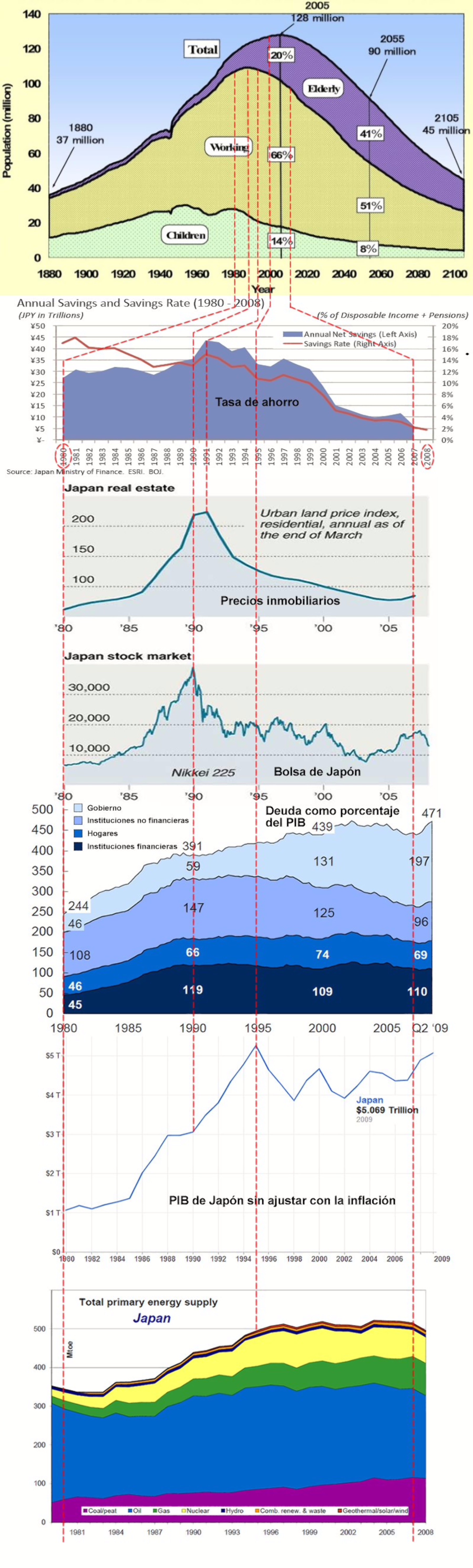 Por otro lado, las consecuencias demográficas sobre la economía son realmente espectaculares, tanto en la fase de ascenso como en la de descenso. Y esto se observa con meridiana claridad en el caso de Japón. Las gráficas se han puesto en vertical para poder comparar mismos periodos de tiempo en diferentes conceptos. Las variables son población, tasa de ahorro, precios inmobiliarios, bolsa, evolución de la deuda, PIB y consumo de energía.