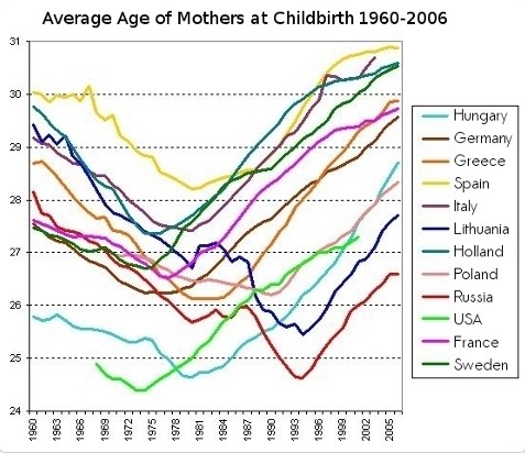 El informe muestra también que la media de edad de las mujeres para su primer parto se ha retrasado considerablemente en las últimas tres décadas. La edad más alta en 2009 fue para Irlanda e Italia con una media de 31,2 y 31,1 años, respectivamente. Las más bajas se dieron en Bulgaria y Rumanía, con 26,6 y 26,9 años, respectivamente. En 13 de los 27 países de la UE las mujeres tienen su primer hijo más tarde de los 30 años.
