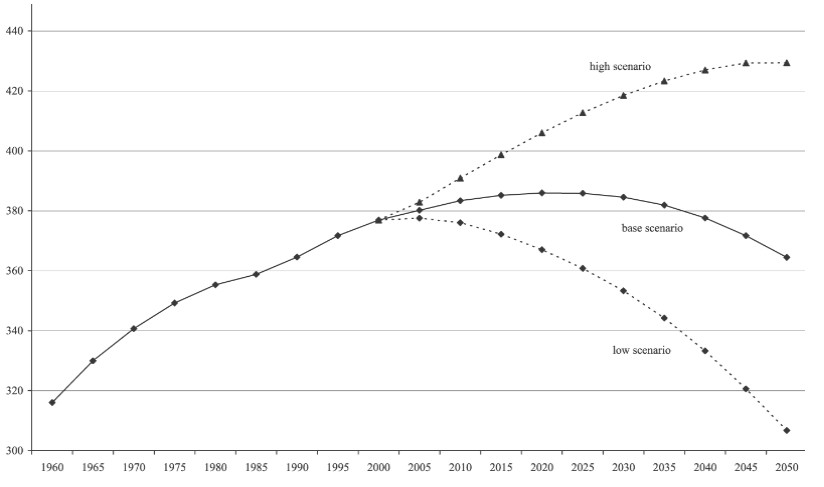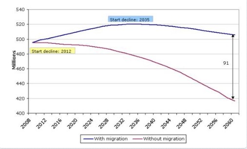 De hecho, la tendencia demográfica que se observa es que sin emigración la UE comenzaría a perder población a partir de 2012, pero con la incorporación de los emigrantes podría retrasarse el comienzo del declive hasta 2035. En efecto, en los 27 estados que conforman la UE nacen 5 millones de niños cada año, superando a las defunciones tan sólo en unos pocos cientos de miles de personas. Por lo tanto, es gracias a los 2 millones de emigrantes que llegan cada año que está creciendo la población en la UE. En esta gráfica se contemplan los tres posibles escenarios demográficos futuros.