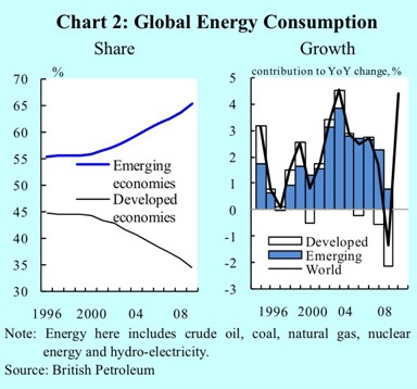De este modo, los países emergentes han sido los protagonistas del reciente aumento de la demanda, con varios factores agravantes. Por ejemplo, sus economías son menos eficientes en el uso de las materias primas que las desarrolladas, lo cual precisa de un mayor consumo de recursos para generar la misma producción. Esto queda reflejado en su cuota de consumo energético, que en la última década no ha parado de aumentar.