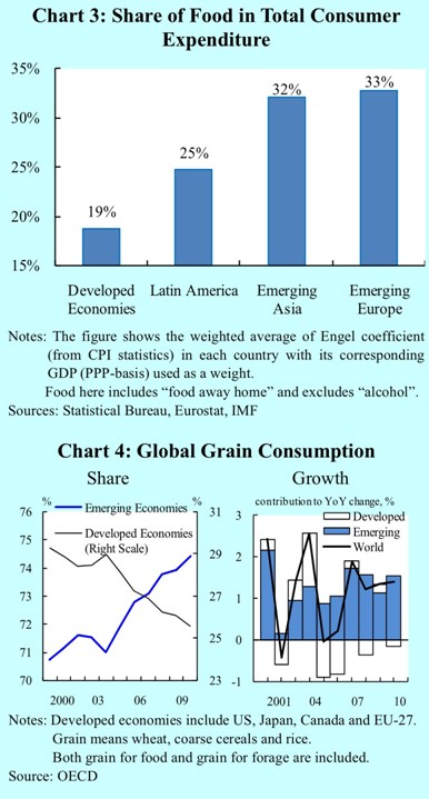Además, el consumo de comida representa una parte mucho más grande de la renta de sus ciudadanos, produciendo así fuertes cambios en la demanda, con el añadido de que el progresivo incremento de su capacidad adquisitiva les permite acceder a alimentos más elaborados y de mayor calidad -aumento de la demanda de carne, por ejemplo, y su impacto indirecto en el mercado de cereales-.
