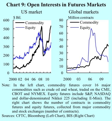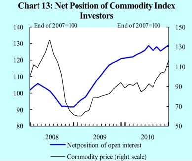 Sin embargo, el incremento de la demanda industrial no explica por sí sola el sustancial incremento de precios relativos (en algunos sectores) a nivel internacional. Así, el informe del BoJ muestra cómo durante la última década las materias primas se han ido convirtiendo en un vehículo de inversión común, sobre todo en las economías desarrolladas, cuando, anteriormente, tan sólo constituían un mercado relativamente pequeño dentro del amplio mundo financiero. El mercado, en su constante búsqueda de diversificación y buenos retornos en el ámbito de las materias primas -sobre todo, en entornos inflacionarios-, ha desarrollado numerosos índices y ETF's centrados en este sector.