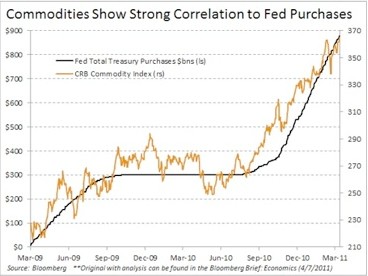 Y ello, pese a que la banca central ya impulsó en 2008 la burbuja del petróleo y lo que evidencian algunos datos en el actual proceso. El siguiente gráfico muestra la correlación existente entre el precio de las materias primas y el inicio de la compra de deuda pública y bonos hipotecarios por parte de la FED (quantitative easing):