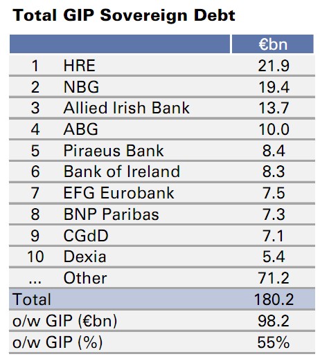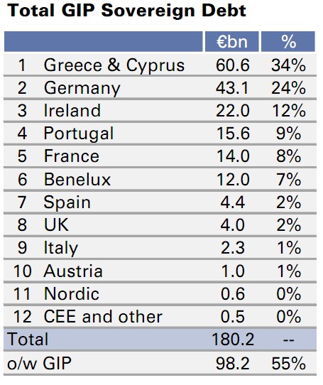La exposición de la banca europea a la deuda pública de Grecia, Irlanda y Portugal (GIP) asciende a un total de 180.000 millones de euros: las entidades acumulan en sus balances bonos helenos por valor de 101.000 millones (el 56% del total), 39.000 millones en deuda portuguesa (22%) y otros 40.000 en bonos irlandeses (22%).