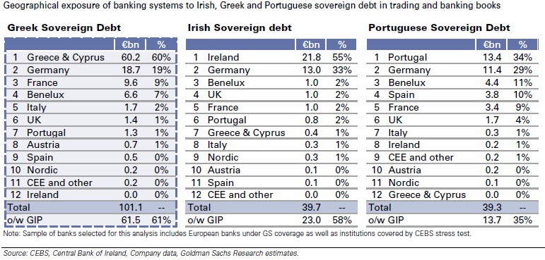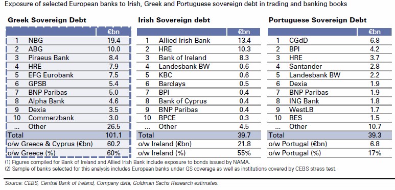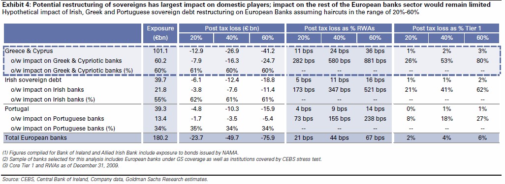 De esta manera, se anticipa una bancarrota que traerá como consecuencia principal que los acreedores no recibirán todo el dinero prometido. La cuestión ahora es saber cómo de grandes serán esas pérdidas. Goldman Sachs pubicó el miércoles un informe en el que analiza las posibles consecuencias de la quiebra, y avisa: el problema no es sólo la caída de Grecia, Irlanda o Portugal, sino el impacto que ésta tendría en la banca europea y, sobre todo, doméstica de estos países en caso de producirse una reestructuración (quita y espera) de deuda pública.