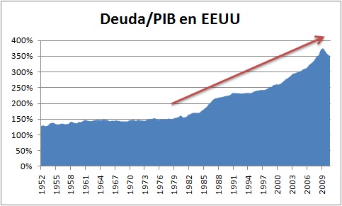 Tendencia paralela a esa explosión del endeudamiento de las últimas tres décadas, coincidente con el fin de los altísimos tipos de interés que Paul Volcker tuvo que colocar a finales de los 70 y principios de los 80 para evitar la desmonetización del dólar en favor del oro:
