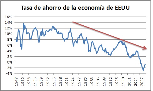 A riesgo de simplificar, pocos elementos ilustran mejor esa desatada ofensiva contra el ahorro y esa desacomplejada promoción del endeudamiento que el definitivo abandono del patrón oro por parte de Estados Unidos. Vean, si no, qué ha sucedido con la tasa de ahorro neta sobre el PIB desde que en 1973 Nixon decidiera enterrar definitivamente Bretton Woods: la capacidad de la economía estadounidense para generar nuevos bienes de capital tras reponer los ya existentes se ha ido desplomando, hasta el punto de que durante esta crisis se ha vuelto negativa (es decir, el ahorro nacional es insuficiente para conservar todas las inversiones ya realizadas bajo el paraguas del brioso endeudamiento previo).