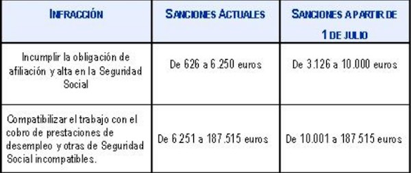 La empresas que tengan contratados a trabajadores de forma irregular tendrán que pagar una multa cinco veces superior a la actual. De esta manera, a partir de agosto la sanción mínima será de 3.126 euros, cinco veces superior a la actual de 626 euros, y máxima de 10.000 euros, frente a los 6.250 euros actuales.