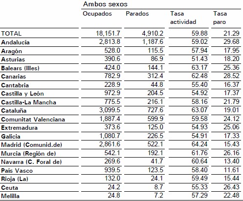 El paro aumentó en 14 comunidades autónomas y en Ceuta en el primer trimestre y bajó sólo en tres regiones y Melilla. El mayor aumento lo registró Andalucía, con 60.200 parados más, seguida de Cataluña (40.900 parados más), Comunidad Valenciana (24.000) y Galicia (23.000 parados más). En el lado opuesto se situó Madrid, con 19.900 desempleados menos, Canarias (2.000 menos), La Rioja (300 menos) y Melilla (500 menos).
