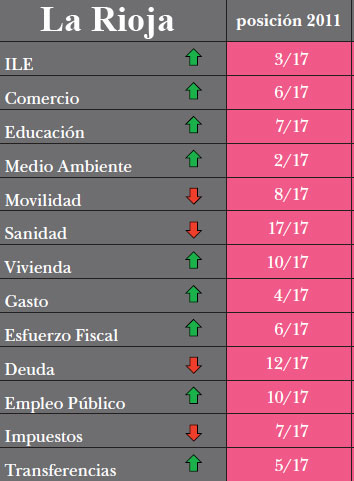 Los indicadores relativos a comercio, medio ambiente, gasto público, esfuerzo fiscal y transferencias están entre los más bajos de España. Donde más destaca es en el apartado de medio ambiente. La Rioja es la segunda región española con menos regulaciones medioambientales. Destaca también por su contenido gasto público, que se situó en 2009 en el 13,5% del PIB. La autonomía gasta poco y tiene una deuda moderada, el ratio entre deuda pública y PIB es del 6,9%.