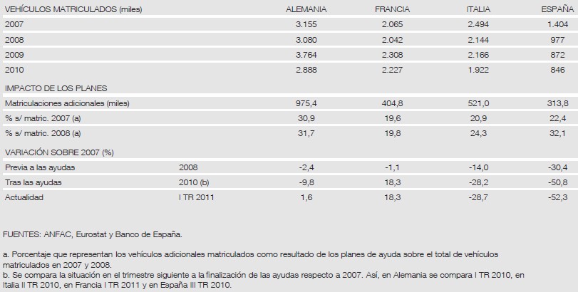 "En resumen, en España y en los principales países de la UEM los programas de apoyo a la adquisición de automóviles impulsaron sustancialmente las matriculaciones en 2009 y, en algún caso, en 2010, estimulando el consumo privado en el momento más álgido de la recesión. Tras el final de las ayudas [...] se produjo un retroceso respecto al período en que estaban en vigor los planes de apoyo. Éstos constituyeron, por tanto, un alivio temporal, que no parece haber supuesto un cambio de la tendencia subyacente en la demanda de automóviles", concluye el organismo. En definitiva, nada cambió, salvo el hecho de que el Gobierno empleó 200 millones de euros de los contribuyentes para costear parcialmente la compra de un coche a más de 300.000 personas.