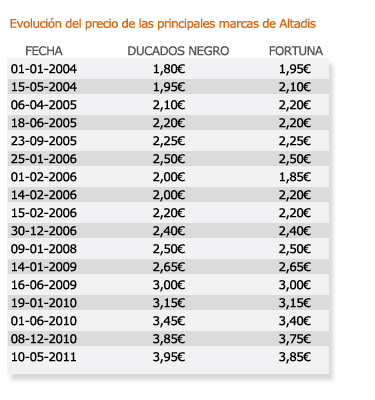 Igualmente Altadis, consciente del éxito de las ventas de los paquetes de picadura, ha incrementado el precio de sus principales marcas nacionales de tabaco de liar. Por ejemplo, Fortuna de 20 gramos pasa a costar de 2,40 a 2,50 €, la marca Orígenes pasa de 3,50 a 3,70 € en su envase de 30 y Ducados Rubio, el líder en el sector de la picadura en 2010, incrementa su precio 20 céntimos para Ducados Rolling de 30 gramos hasta los 3,65 €.