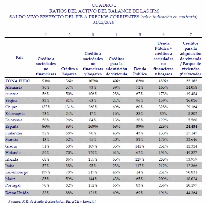 En primer lugar, cabe señalar que el conjunto de la deuda pública y privada (excluyendo el sector bancario) de España asciende al 228% del PIB en 2010, muy por encima de la media de la zona euro (columna 6 del cuadro 1). "Sólo Chipre, Irlanda, Grecia, Portugal y Luxemburgo presentan unos ratios de endeudamiento y, por tanto, una exposición al riesgo de crédito de sus sistemas financieros, superiores al de España", indica el documento.