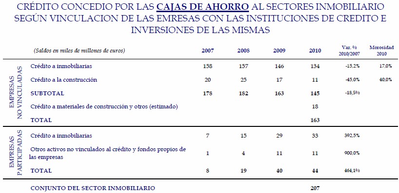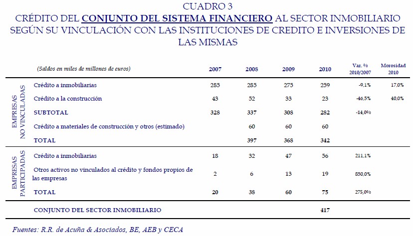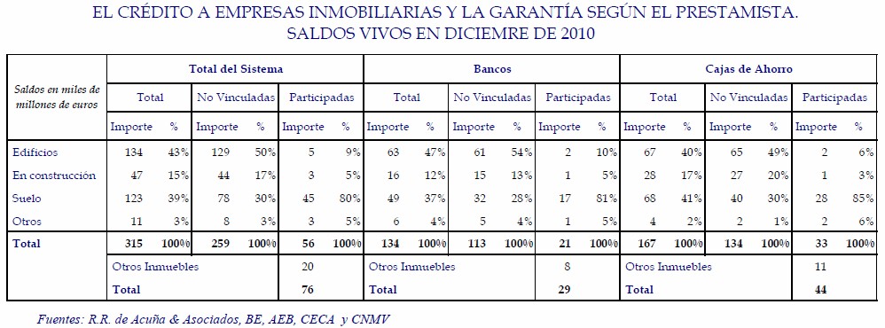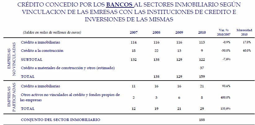 Según el estudio,el crédito ligado al sector inmobiliario asciende a un total de 417.000 millones de euros en 2010, que equivale al 42% del crédito global otorgado a sociedades no financieras. De esta cuantía hay que distinguir entre el crédito concedido a terceros (empresas no vinculadas al sector financiero), que suma 342.000 millones, y a sociedades participadas por bancos y cajas (otros 75.000 millones).