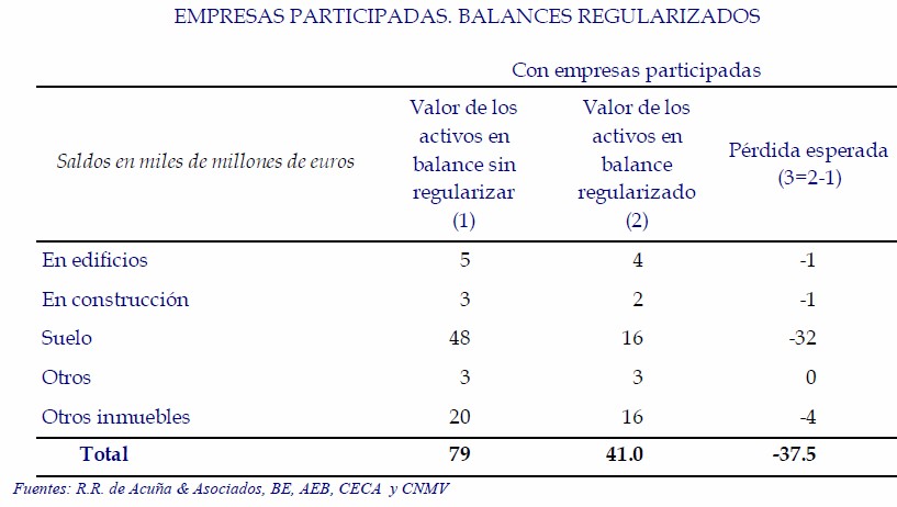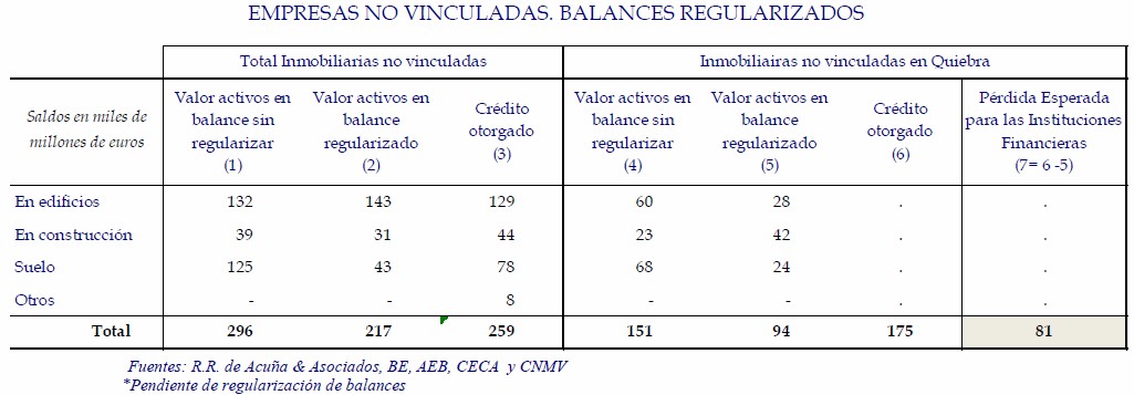 A este debate se suma ahora R.R. de Acuña, cuyo informe analiza la capacidad del sistema financiero español para hacer frente al riesgo derivado de la exposición inmobiliaria (créditos concedidos al sector). En concreto, el estudio cuantifica el volumen total del crédito otorgado al conjunto del sector inmobiliario para, seguidamente, calcular los requerimientos de capital y reservas necesarios para hacer frente a los potenciales impagos, garantizando así la solvencia de las entidades financieras.