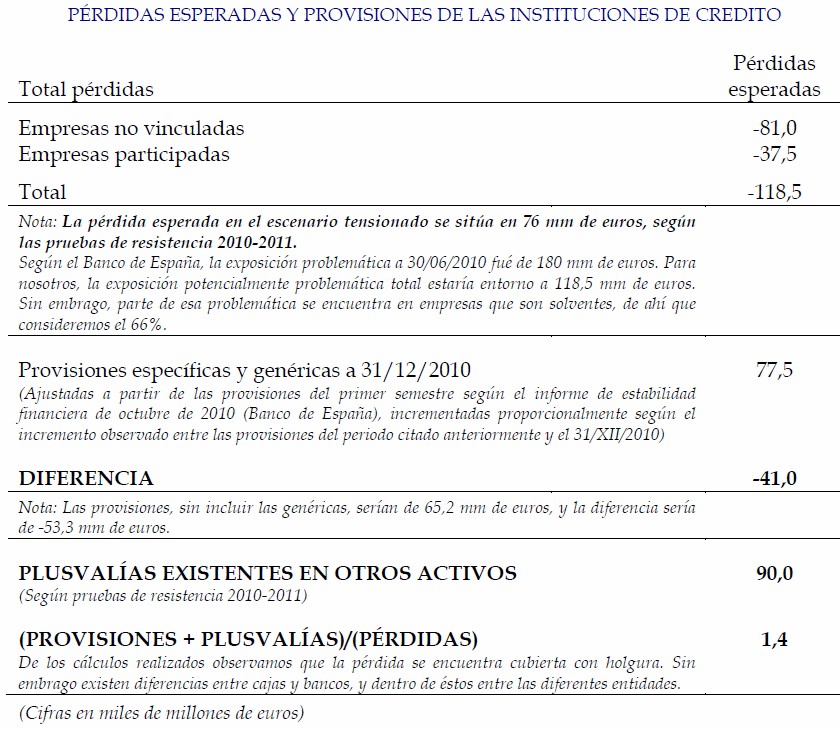 Sin embargo, una gran parte de estos números rojos se cubrirían gracias a las provisiones que acumulaba el sistema financiero a finales de 2010 (77.500 millones). De este modo, las pérdidas inmobiliarias esperadas se sitúan en 41.000 millones de euros, según especifica la consultora. Una cifra que sumada a los otros 20.000 millones que, como mínimo, procederán de empresas constructoras y de materiales ofrece unas pérdidas esperadas totales de 61.000 millones de euros para el sector financiero. Esta cuantía es la que ahora se precisa sanear.