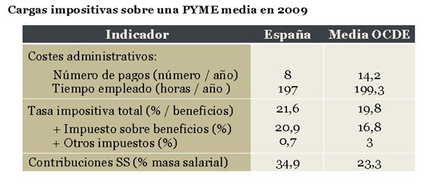 Las PYMES españolas no solo se encuentran más castigadas fiscalmente por el impuesto sobre beneficios -alrededor de 4 puntos por encima respecto a la media OCDE- sino, especialmente, por las elevadas cotizaciones sociales, que superan en casi 12 puntos al promedio de los países desarrollados de la OCDE.