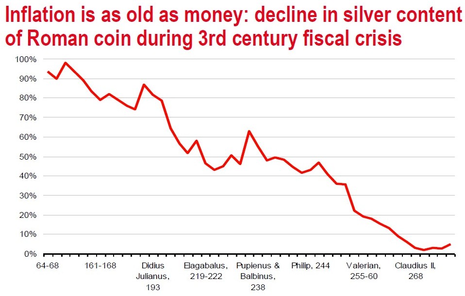 Pero no todos los partidarios del oro son partidarios acérrimos del patrón oro. Según el inversor Jim Rogers, "el patrón oro nunca ha funcionado realmente bien a largo plazo, ni el patrón plata, porque los políticos siempre encuentran una forma de esquivarlo. Lo devalúan, cambian las reglas o lo que sea. Basta con que te fijes en Roma". Por lo que su "solución sería no dictarle a la gente lo que debe usar como dinero. Una vez les das a los políticos el derecho a monopolizar el dinero, pueden hacer lo que les plazca". El siguiente gráfico refleja el envilecimiento de las monedas de plata durante tres siglos en el antiguo Imperio Romano.
