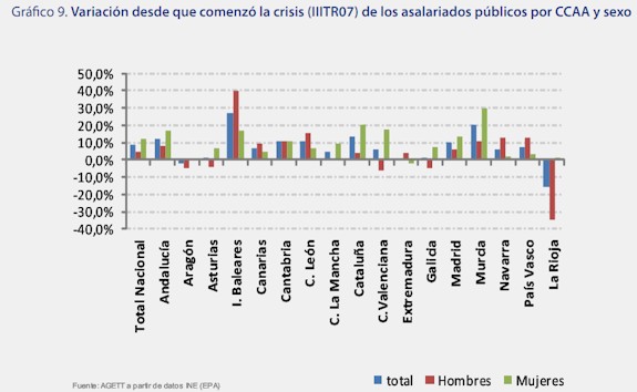 Por otra parte, también destaca que siete de cada diez nuevos empleados públicos desde que comenzó la crisis, son mujeres. El colectivo femenino es el que cuenta con un mayor peso en la generación de empleo público desde el tercer trimestre de 2007. Así, se han creado 187.300 empleos femeninos, lo que representa el 73,7% del total del empleo público generado en este periodo (+254.000). Es relevante que en las dos únicas comunidades que han destruido empleo público (Aragón y La Rioja), todo el ajuste se haya producido en el empleo masculino, mientras que Extremadura se posiciona como la única CCAA que ha destruido empleo público femenino.