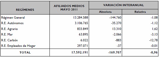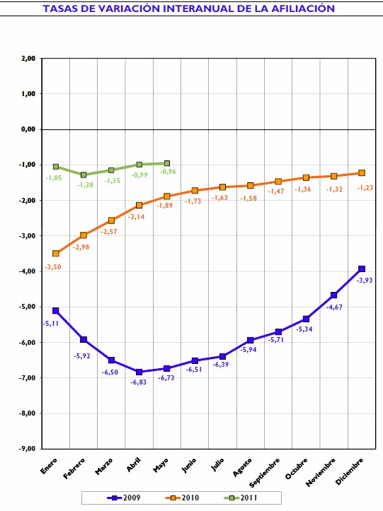 Con respecto a abril, los datos desestacionalizados muestran que el empleo crece en el sector servicios (16.450 empleos más), hasta un total de 12.684.424 ocupados; y en la agricultura, ganadería y pesca (8.959), hasta un total de 1.198.425; mientras que sigue cayendo en la industria (-5.909), hasta los 2.241.238 afiliados; y en la construcción (-28.264), hasta los 1.404.709. Sin embargo, a nivel interanual no se salva ningún sector, ya que todos pierden afiliados respecto mayo de 2010, encabezado por la construcción (182.635 afiliados menos).