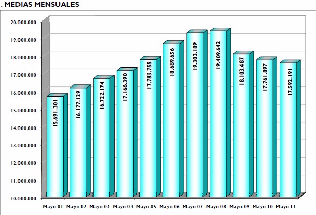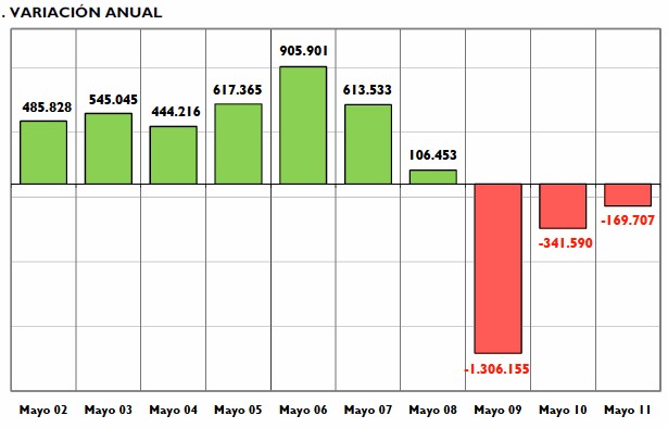 Por otro lado, aunque turismo y sector público están generando empleo temporal, la economía española sigue destruyendo puestos de trabajo en comparación con 2010. Volviendo a los números absolutos (incluyendo efecto calendario), la Seguridad Social registró 169.707 cotizantes menos en los últimos doce meses, con una destrucción laboral del -0,96%, aunque nuevamente se trata de un descenso interanual inferior al registrado en mayo de 2010 (-1,89%).