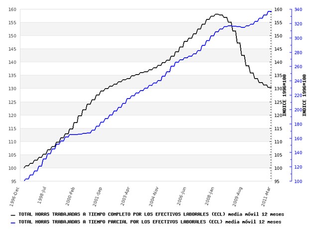 Este aumento del empleo a tiempo parcial, técnicamente, se considera subempleo, ya que muchas son personas que desean trabajar la jornada completa y sólo encuentran trabajo a tiempo parcial. En el siguiente gráfico se puede observar cómo el empleo a tiempo completo sigue bajando -de hecho, se encuentra a niveles de 2001-, mientras que el empleo a tiempo parcial continúa en aumento.