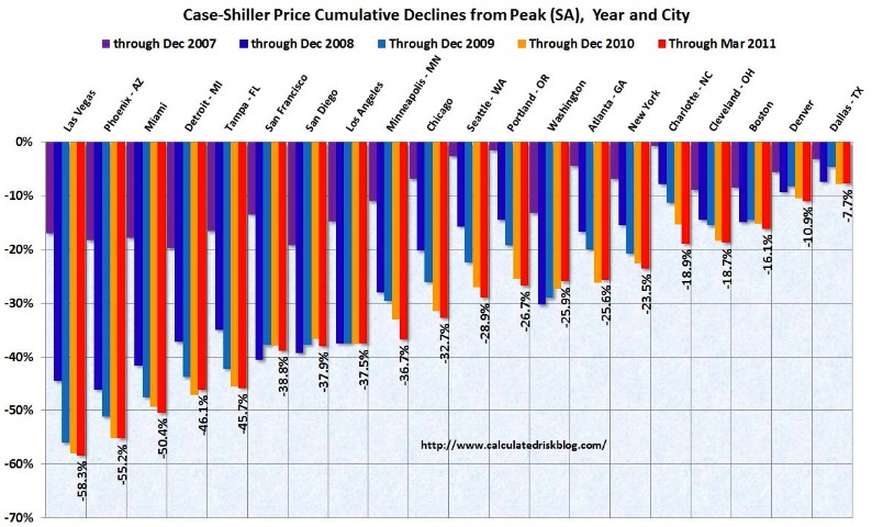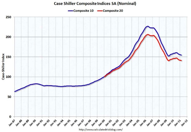 El precio de la vivienda en EEUU ha vuelto a registrar caídas en el primer trimestre de 2011 tras un período más o menos sostenido de moderados ascensos el pasado año. Los estímulos fiscales puestos en marcha por el Gobierno de Barack Obama lograron inflar, temporalmente y de forma artificial, el mercado inmobiliario del país, en un proceso similar al que experimentó la venta de vehículos en España en 2010 gracias al Plan 2000E (subvenciones públicas).