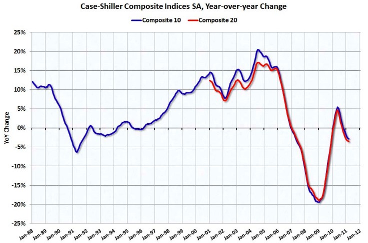 En concreto, el precio nominal de la vivienda en las veinte mayores ciudades de EEUU registró un descenso del 4,2% en el primer trimestre de 2011, después de que cayera otro 3,6% en el cuarto trimestre de 2010. La caída interanual asciende al 5,1% en los tres primeros meses del año.