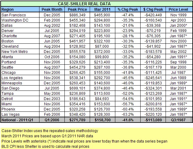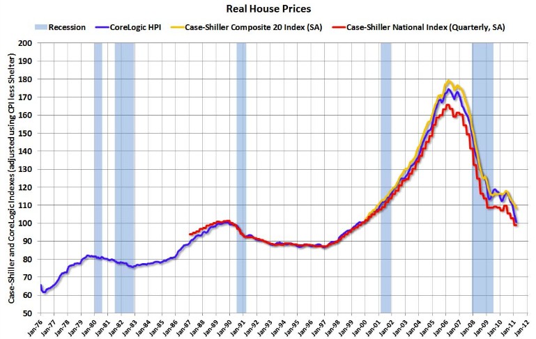 El precio real medio de las casas ha descendido un 41,6% desde el primer trimestre de 2006 (valor máximo), casi 113.000 dólares menos, regresando así a niveles del cuarto trimestre de 1999. De hecho, incluso se puede retroceder algo más en el tiempo para observar que el precio real se sitúa ya en niveles no vistos desde 1987, según muestra el mismo índice Case-Shiller (en términos reales). Esto significa que, hoy por hoy, ya es posible comprar una vivienda a precios equiparables a los de hace 25 años.