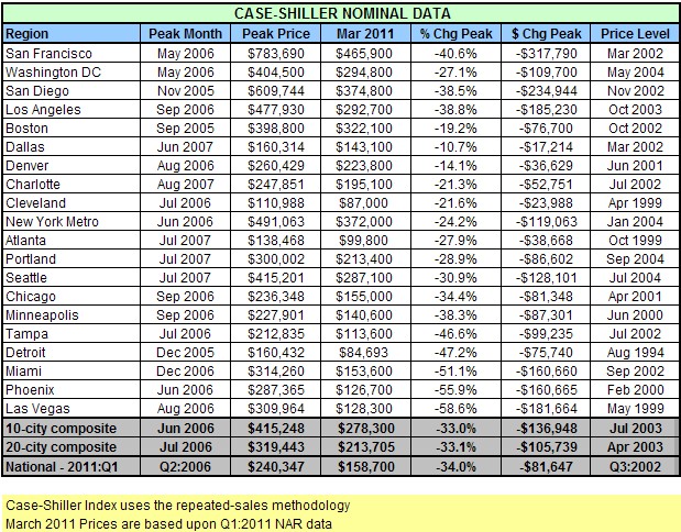 De este modo, "a nivel nacional, el precio [medio] de las viviendas en este momento ha retrocedido a los niveles de mediados de 2002", según Standard & Poor's. Esto supone un descenso acumulado medio del 34% desde el pico máximo alcanzado en 2006, en plena burbuja inmobiliaria: desde los 240.000 dólares hasta los 158.000, una rebaja de casi 80.000 dólares en los últimos cinco años. El precio medio de la vivienda en términos nominales (incluida la inflación) ha retrocedido a niveles del tercer trimestre de 2002.