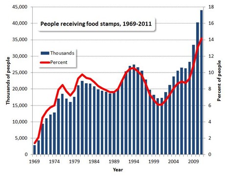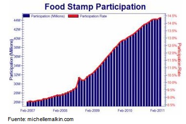 Unos 44,5 millones de estadounidenses recurrieron a estos cupones el último mes, según los datos del departamento de Agricultura, responsable del programa. Se trata de un récord histórico tanto en números absolutos como relativos: más del 14% de la población. Es decir, casi uno de cada siete americanos recibe comida pagada por el gobierno, en un país cuyo principal problema de salud es la obesidad.