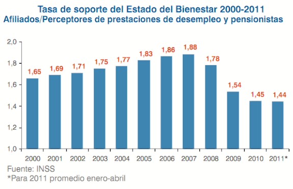 Según el último estudio de Agett (Asociación de Grandes Empresas de Trabajo Temporal), la tasa de soporte se ha reducido en España desde el 1,88 de 2007 al 1,44 del primer trimestre de 2011. Este ratio mide la proporción entre afiliados y parados y pensionistas. Es decir, contabiliza algo así como el número de cotizantes que sostienen a cada perceptor de un subsidio estatal. Y en España, este número ha estado cayendo de forma constante desde hace cuatro años.