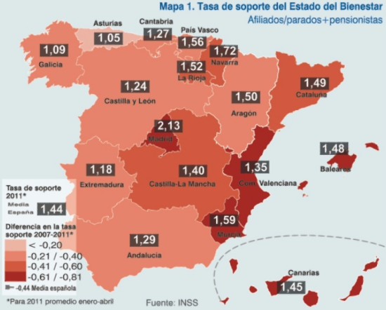 Además, no en todas las regiones la situación es homogénea. De esta manera, en Madrid la tasa de soporte es de 2,13, una cifra modesta en comparación con la de otros países pero suficiente para asegurar las prestaciones. Al mismo tiempo, en Navarra con 1,72 y Valencia con 1,59 se mantienen ratios razonables.