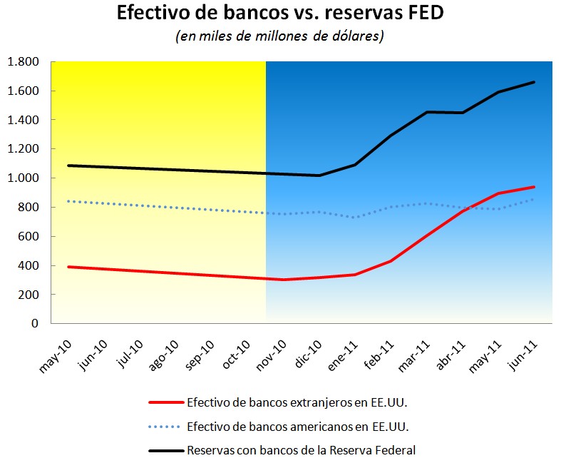 Obsérvese en el siguiente gráfico la coincidencia en la variación del efectivo en el activo del balance de los bancos extranjeros (línea roja) con las reservas en el pasivo del balance de la Reserva Federal (línea negra) durante el QE2 (zona azul), iniciado el 3 de noviembre de 2010 y activo hasta finales del presente mes. Mientras tanto, el efectivo en el activo del balance de los bancos americanos en su propio país (en puntos azules) permanece prácticamente inalterado.